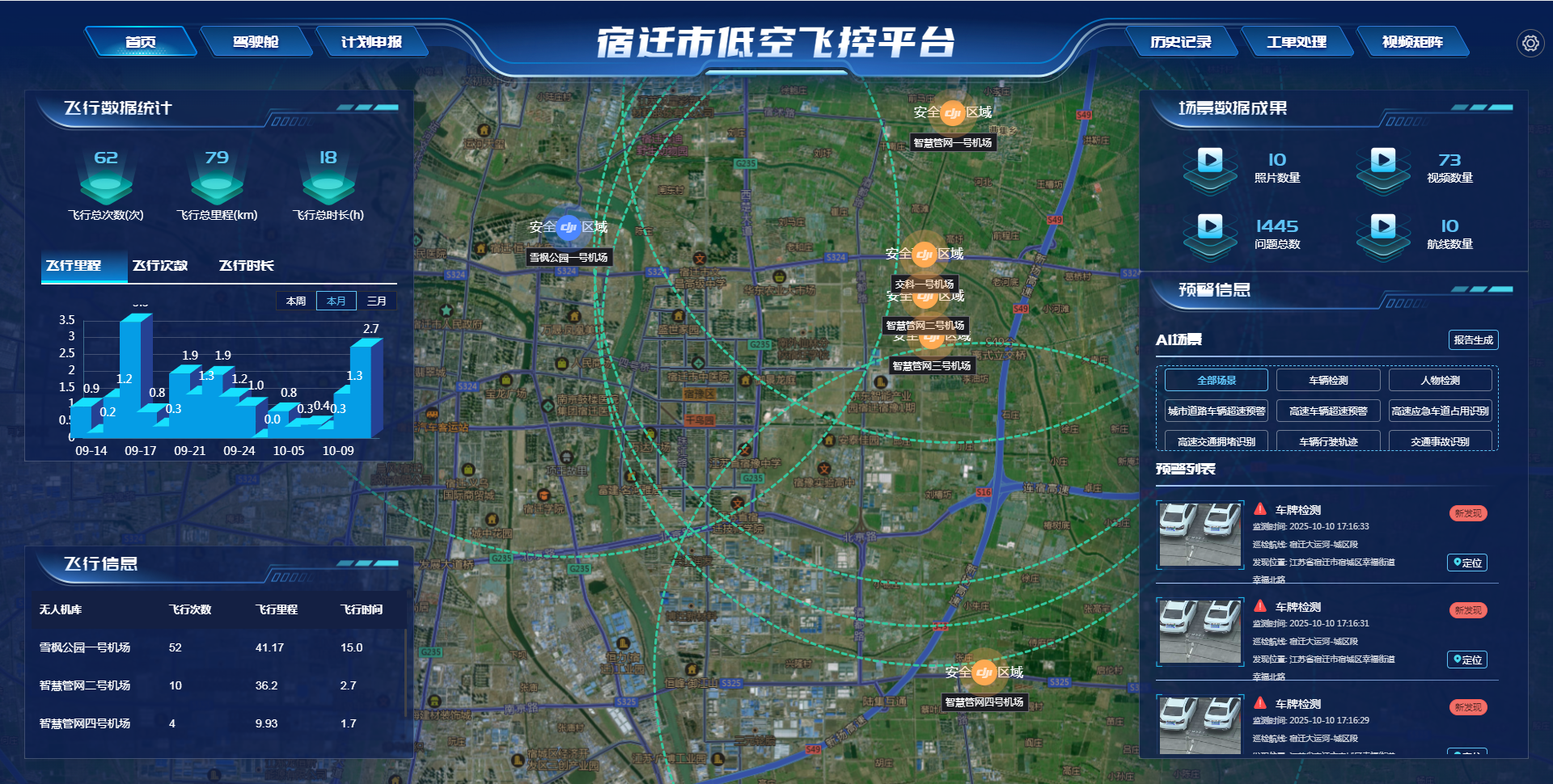 在宿遷市低空飛行服務(wù)中心,一組組高效率數(shù)據(jù)智能化場景應(yīng)用刷新大眾眼球:依托無人機AI平臺,自動識別道路施工中隱患行為,同時自動標(biāo)記隱患位置、推送預(yù)警信息并督促相關(guān)方整改,形成全鏈條的管理閉環(huán);通過無人機移動的攝像頭,能夠?qū)崟r監(jiān)控學(xué)校周邊交通狀況,并通過喊話功能引導(dǎo)車輛有序通行……